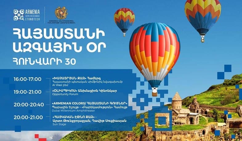 Հայաստանի ազգային օրը «Expo 2020 Dubai» համաշխարհային ցուցահանդեսում կնշվի հունվարի 30-ին, որին մասնակցելու նպատակով Դուբայ կմեկնի ՀՀ էկոնոմիկայի նախարար Վահան Քերոբյանի գլխավորած պատվիրակությունը։