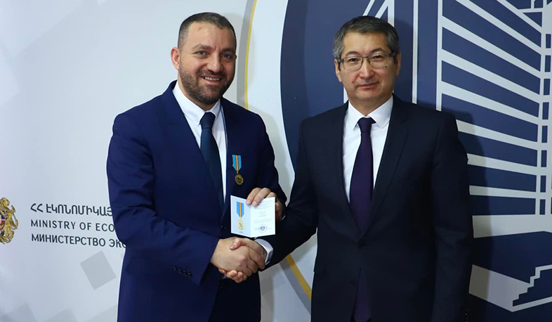 Հանդիպման ավարտին դեսպան Բոլատ Իմանբաևը Վահան Քերոբյանին է հանձնել Ղազախստանի նախագահի կողմից շնորհված մեդալը` նվիրված Ղազախստանի անկախության 30-ամյակին։