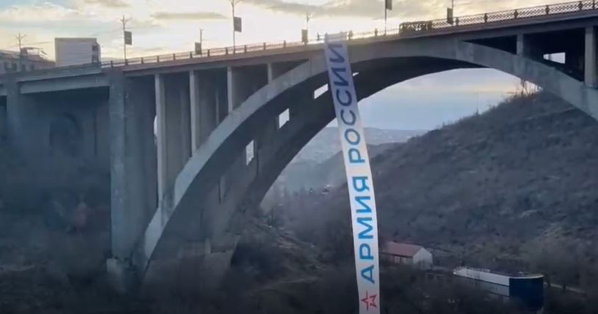 Այսօր առավոտյան համացանցում լուսանկարներ և տեսանյութ տարածվեցին, որտեղ երևում էր, որ Կիևյան կամրջից «Армия России» վերտառությամբ պաստառ է կախված։