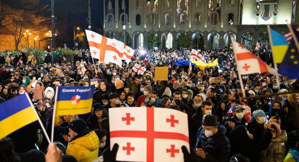 Թբիլիսիում արդեն մի քանի օր է զագվածային ցույցեր են՝ ի աջակցություն Ուկրաինայի։ Նախագահ Սալոմե Զուրաբիշվիլին հասարակական տրամադրությունների արտացոլումն է. նա աջակցություն է հայտնում Ուկրաինային և շրջագայում եվրոպական մայրաքաղաքներով։ Վարչապետ Իրակլի Ղարիբաշվիլին, որն ավելի բարձր պաշտոն է զբաղեցնում, նրա համեմատ ողորմելի և երկչոտ տպավորություն է թողնում։ Նա բացահայտ կերպով հրաժարվում է դատապարտել Ռուսաստանին, որի հետևանքով հանդիմանության է արժանացել իր ուկրաինացի գործընկերոջից։