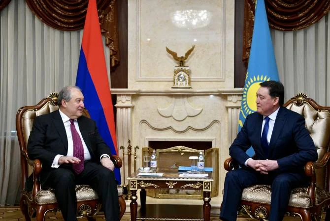 armenpress.am։ Աշխատանքային այցով Ղազախստանում գտնվող Հայաստանի Հանրապետության նախագահ Արմեն Սարգսյանը հանդիպում է ունեցել Ղազախստանի վարչապետ Ասկար Մամինի հետ: