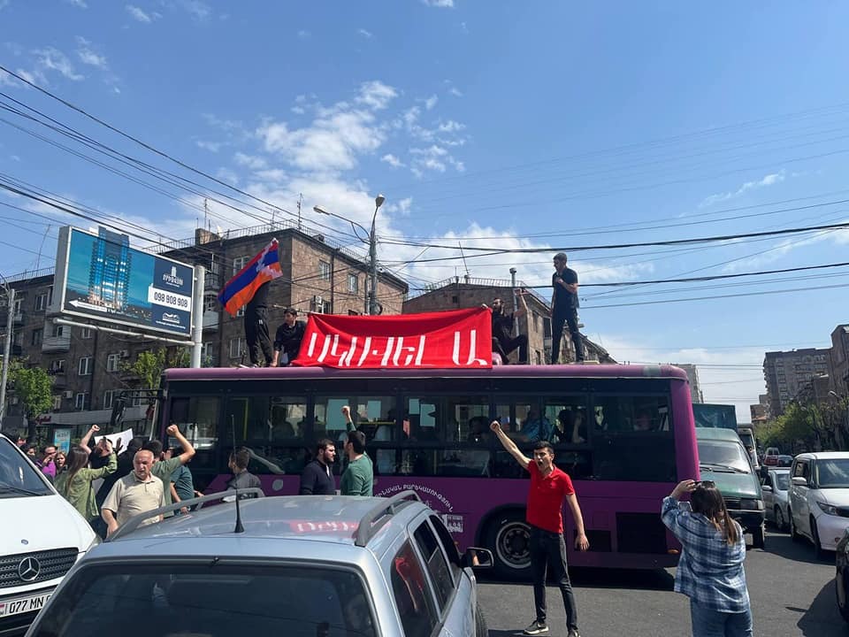 Նրանցից մի քանիսը բարձրացել են ուղևորատոր ավտոբուսի վրա՝ պարզել Արցախի դրոշն ու «Սկսել ա» գրությամբ պաստառը։