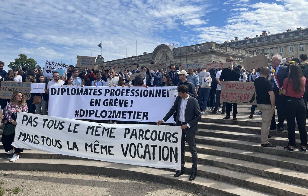 Ֆրանսիացի դիվանագետների արհմիությունների ասոցիացիաների կողմից կազմակերպված սոցիալական բողոքի ակցիան նպատակ ունի ցույց տալ արտաքին քաղաքական գերատեսչության աշխատակիցների անհամաձայնությունը կազմակերպչական բարեփոխումների հետ։ Ապրիլին իշխանությունների կողմից հաստատված բարեփոխումներն արմատապես փոխում են դիվանագիտական կորպուսի կազմավորման սկզբունքները։