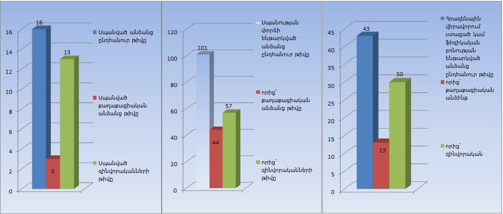 Սպանվել է 16 անձ (3-ը՝ քաղաքացիական), սպանության փորձի ենթարկվել 101-ը (44-ը՝ քաղաքացիական), հրազենային վիրավորում ստացել և ֆիզիկական բռնության ենթարկվել՝ 43-ը:
