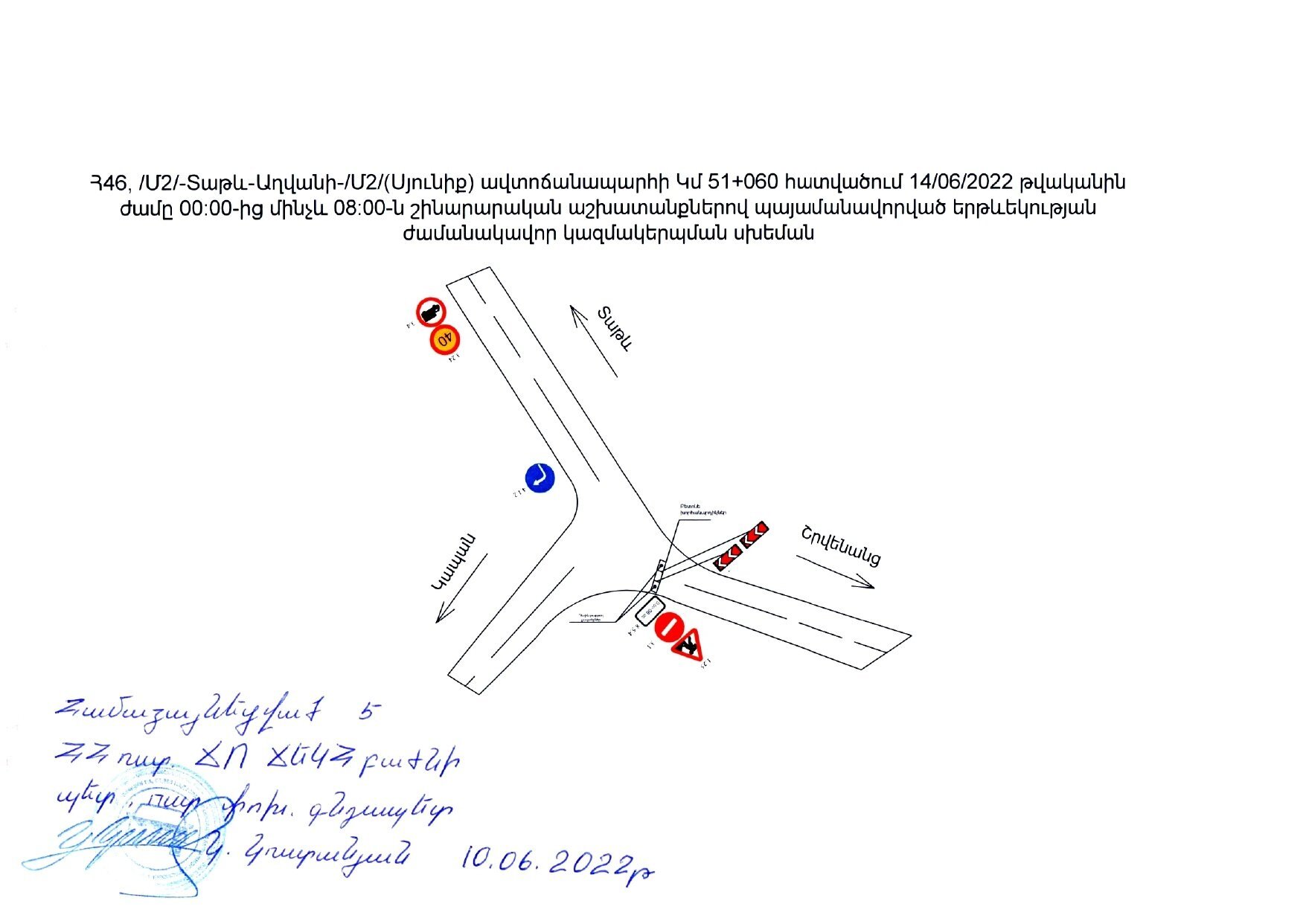 Վերոնշյալ ճանապարհը հունիսի 14-ին՝ ժամը 00։00-ից մինչև 08։00-ն, շինարարական աշխատանքներով պայմանավորված, փակ է լինելու բոլոր տեսակի տրանսպորտային միջոցների համար։