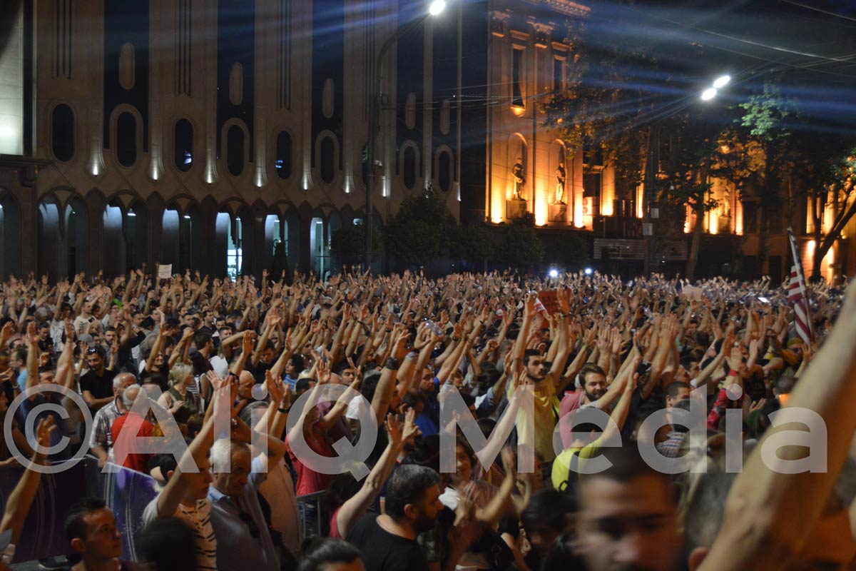 aliq.ge: Թբիլիսիում խորհրդարանի շենքի հարակից տարածքից ցուցարարները երթով շարժվեցին դեպի իշխող «Վրացական երազանք» կուսակցության գրասենյակ: